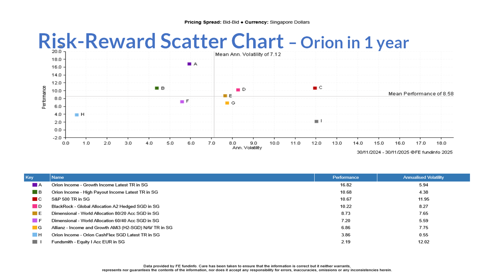 The 1-Year Risk-Reward scatter chart reveals how Orion Income Portfolios were able to perform well above their peers, while maintaining much lower volatility.